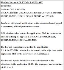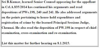 அ.இ.அ.தி.மு.க பொதுச் செயலாளர் ஜெ.ஜெயலலிதா உள்ளிட்டோர் தாக்கல் செய்துள்ள மேல்முறையீட்டு மனுவின் விசாரணை, கர்நாடக உயர் நீதிமன்றத்தில் நீதிபதி சிக்கா ராசப்பா குமாரசாமி முன்னிலையில் விசாரிக்கப்பட்டு வருகிறது.