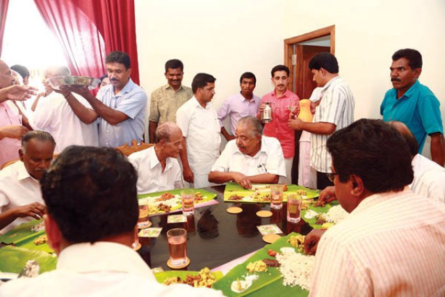 அப்போது மணமக்கள் இருவரும் கேரள முதல்–மந்திரி உம்மன் சாண்டி, எதிர்க்கட்சி தலைவர் வி.எஸ்.அச்சுதானந்தன் ஆகியோர் காலில் விழுந்து ஆசி பெற்றனர்.