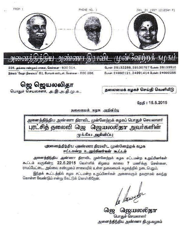 Home|News|அ.இ.அ.தி.மு.க. எம்.எல்.ஏ.க்கள் கூட்டம் வருகின்ற 22 ஆம் தேதி நடைபெறும் : ஜெ. ஜெயலலிதா அறிவிப்பு! -டாக்டர் துரைபெஞ்சமின். drduraibenjamin@yahoo.in