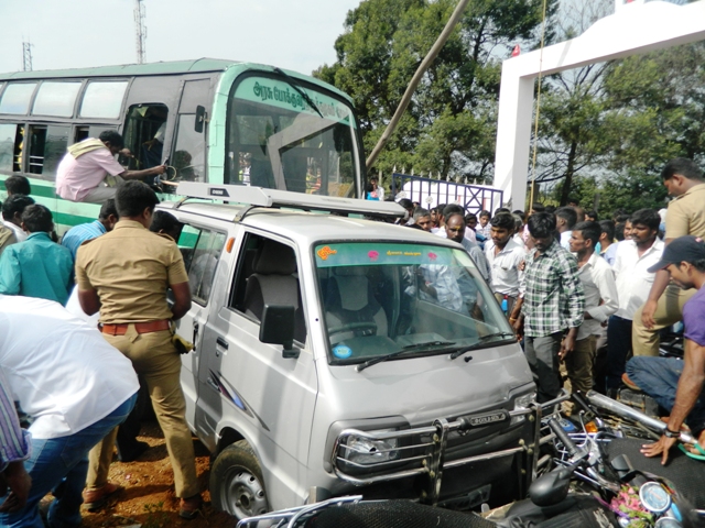 கோவிலுக்கு இயக்கப்பட்ட பேருந்துகளில், அரசு பேருந்து ஒன்று கோவிலில் இருந்து வெளியே வரும்போது, டிரைவரின் கட்டுப்பாட்டை இழந்து முன்சென்ற ஒரு ஆம்னி கார், 5 இரு சக்கர வாகனங்களை மோதி நசுக்கியது.