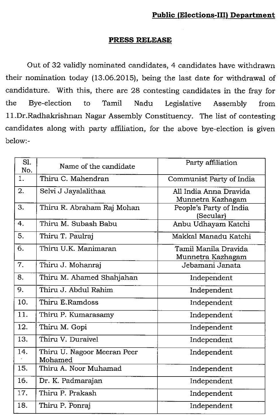 வேட்பாளர்கள் போட்டியில் இருந்து விலகிக்கொண்டதை அடுத்து, ஆர்.கே.நகர் தொகுதியில் அ.தி.மு.க. வேட்பாளர் ஜெ.ஜெயலலிதா, இந்திய கம்யூனிஸ்டு கட்சி வேட்பாளர் சி.மகேந்திரன் உள்பட 28 பேர் களத்தில் உள்ளனர். ஜெ.ஜெயலலிதா, சி.மகேந்திரன் மற்றும் 26 சுயேச்சை வேட்பாளர்கள் பெயர் பட்டியலை தேர்தல் ஆணையம் நேற்று மாலையில் வெளியிட்டது.