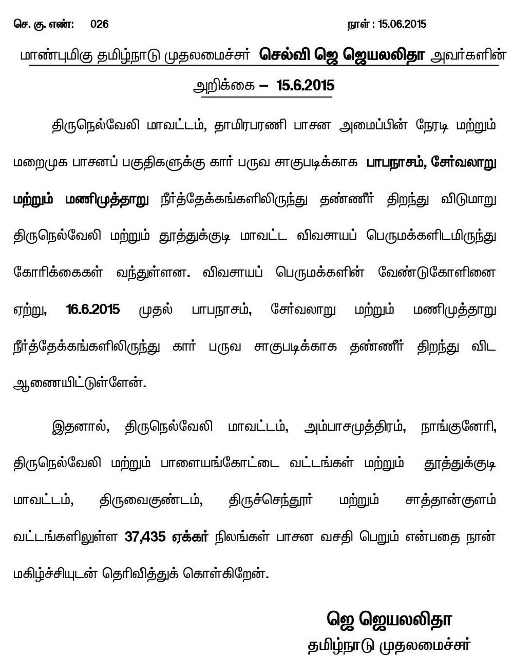 பாபநாசம், சேர்வலாறு, மணிமுத்தாறு நீர்த்தேக்கங்களிலிருந்து தண்ணீர் திறக்க, தமிழக முதல்வர் ஜெ.ஜெயலலிதா உத்தரவு!