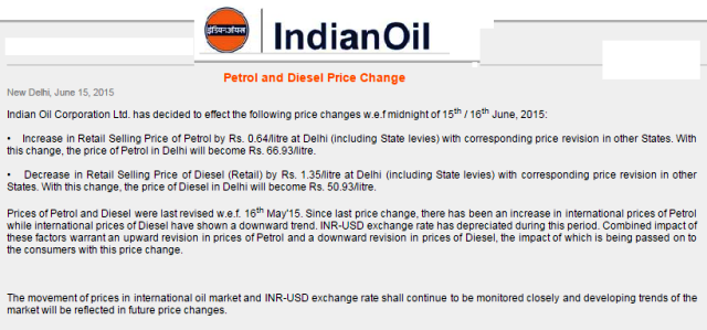 பெட்ரோல் விலை லிட்டருக்கு 64 காசுகள் உயர்த்தப்பட்டுள்ளதாகவும், டீசல் விலை லிட்டருக்கு 1.35 காசுகள் குறைக்கப்பட்டுள்ளதாகவும், இந்த விலை உயர்வு 16.05.2015 நள்ளிரவு முதல் அமலுக்கு வரும் என்றும், எண்ணெய் நிறுவனங்கள் அறிவித்துள்ளன. இதனால் நாட்டு மக்கள் கவலையடைந்து உள்ளனர்.