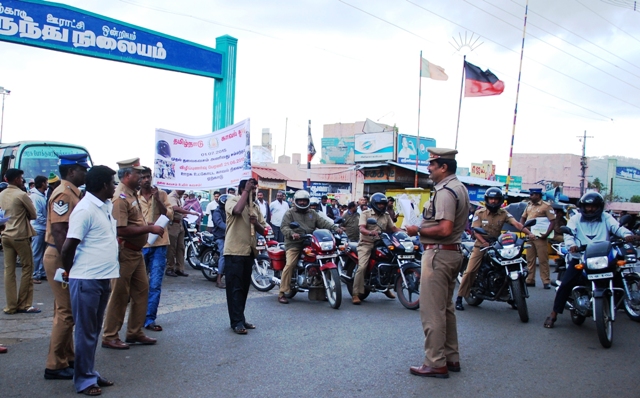 மேலும், வாகன ஓட்டிகளுக்கு தலைகவசம் அணிவதால் ஏற்படும் நன்மைகள் குறித்தும், அணியாமல் சென்றால் கிடைக்கும் தண்டனைகள் குறித்தும், விளக்கும் துண்டு பிரசுரங்களை வழங்கினர்.