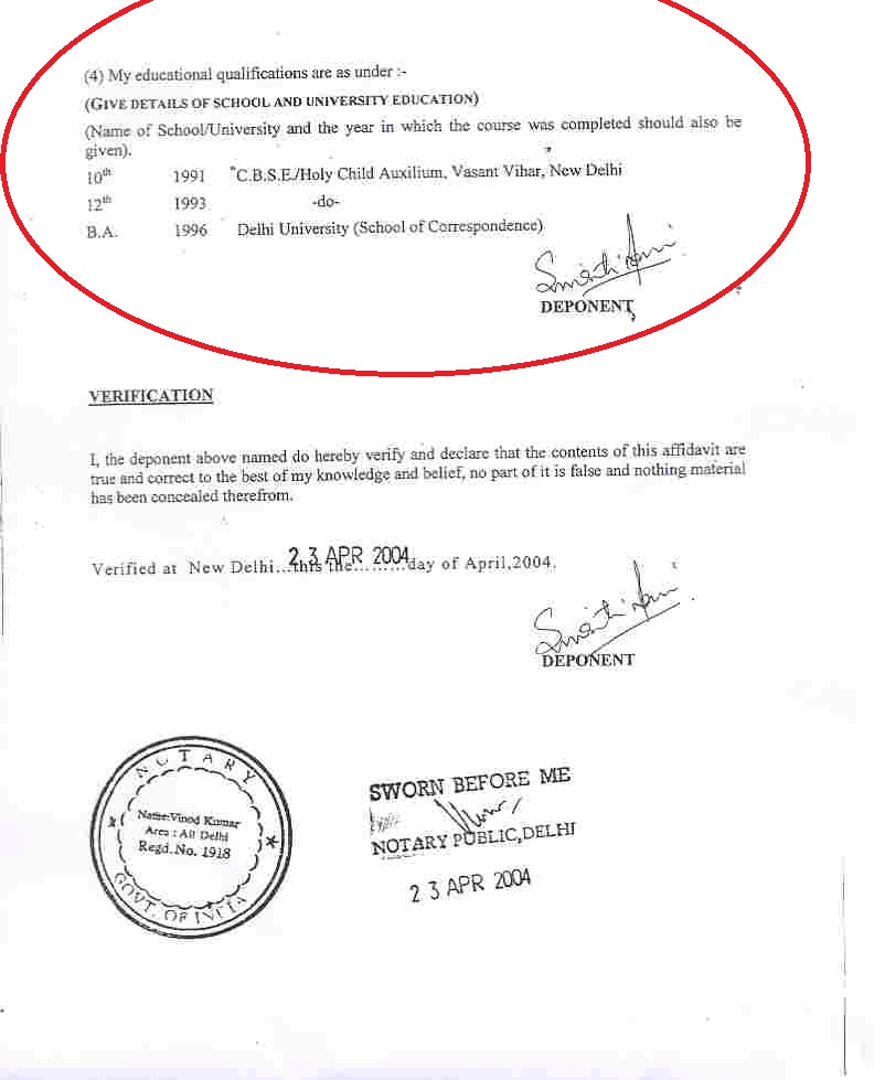 இதில், ஆம் ஆத்மி கட்சியின் முன்னாள் சட்ட அமைச்சர் டோமர் மீது எடுக்கப்பட்ட நடவடிக்கை போன்று, மத்திய அமைச்சர் ஸ்மிருதி இரானி மீதும் நடவடிக்கை எடுக்க வேண்டும் என வாதங்கள் வைக்கப்பட்டன.
