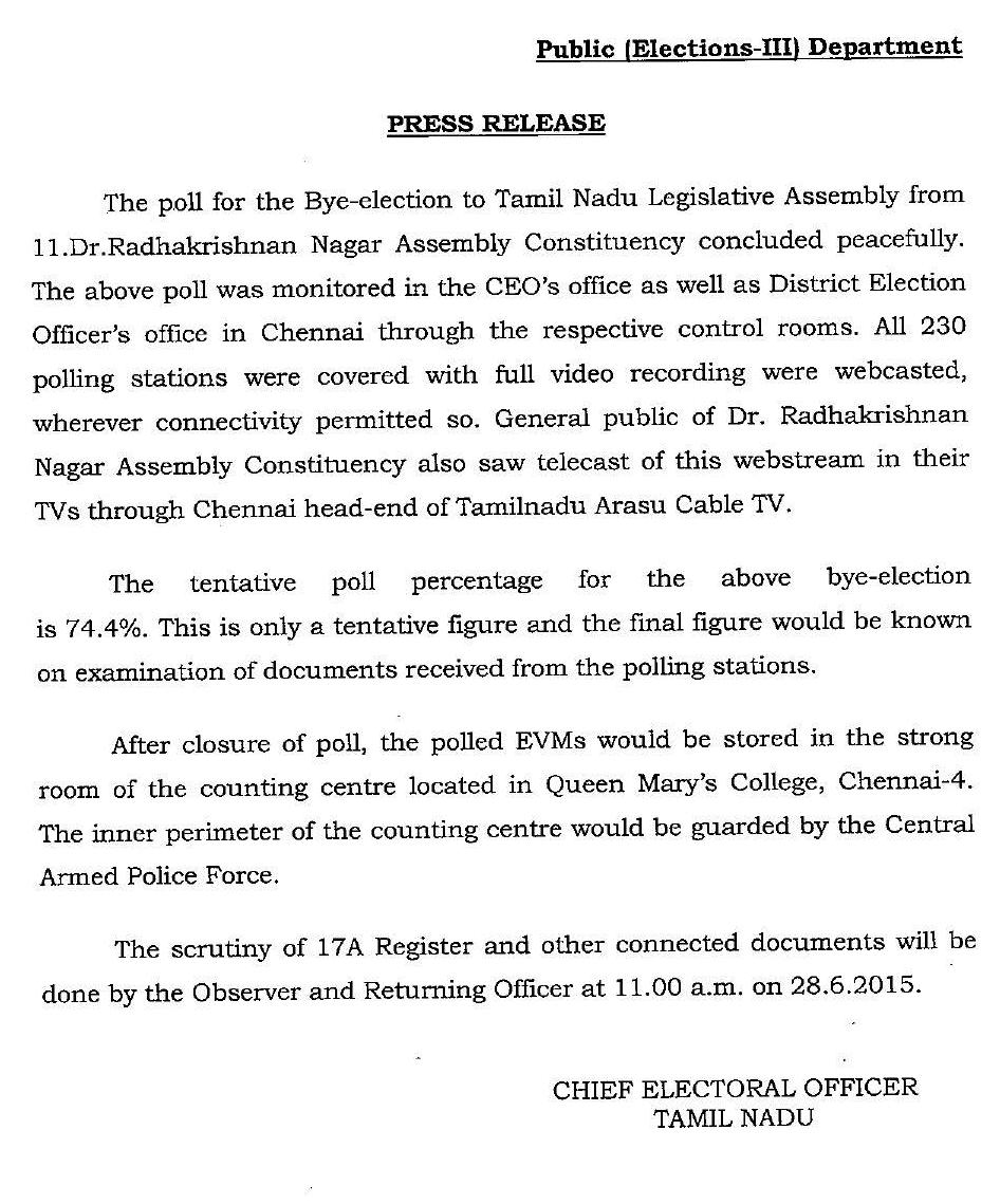 சென்னை ஆர்.கே.நகர் இடைத்தேர்தல் ன்று நடைபெற்றது.  காலை 8 மணிக்கு தொடங்கிய வாக்குப்பதிவு மாலை 5 மணிக்கு முடிந்தது. 5 மணிக்கு முன்னதாக வாக்குச்சாவடிக்கு வந்து வரிசையில் நின்றவர்களுக்கு வாக்களிக்க அனுமதி அளிக்கப்பட்டது. 74.4 சதவீத வாக்குகள் பதிவாகி உள்ளன. பெண் வாக்காளர்கள் 74.8 சதவீதமும், ஆண் வாக்காளர்கள் 74 சதவீதமும் வாக்களித்துள்ளனர் என்று தமிழக தலைமை தேர்தல் அதிகாரி சந்தீப் சக்சேனா செய்தியாளர்களிடம் தெரிவித்துள்ளார்