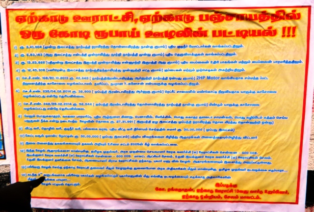 பஞ்சாயத்திற்கு குடிநீர் மோட்டார் வாங்கியது, புதிய தெருவிளக்கு வாங்கியது, புதிய பைப்லைன் வாங்கியது, பைப்லைன் பராமரித்தல், குப்பை மற்றும் முட்செடிகள் அகற்றியது, மோட்டார் வாங்கியதற்காக கம்பெனிக்கு செக் வழங்காமல் கணேசன் எனும் தனிநபருக்கு வழங்கியது, மேலும் பொது சுகாதாரம், வாகன பராமரிப்பு, புதிய ஆழ் துளை கிணறு, பினாயில், கழிப்பிடம் சுத்தம் செய்தல், வீட்டு வரி மற்றும் குடிநீர் வரி உள்ளிட்டவைகளுக்கு வரி நிர்ணயம் செய்தல், உள்ளிட்டவைகளில் ஏற்காடு ஊராட்சி மன்ற தலைவர் முரளி ஒரு கோடி ரூபாய் ஊழல் செய்துள்ளதாக போஸ்டரில் குறிப்பிடப்பட்டுள்ளது.