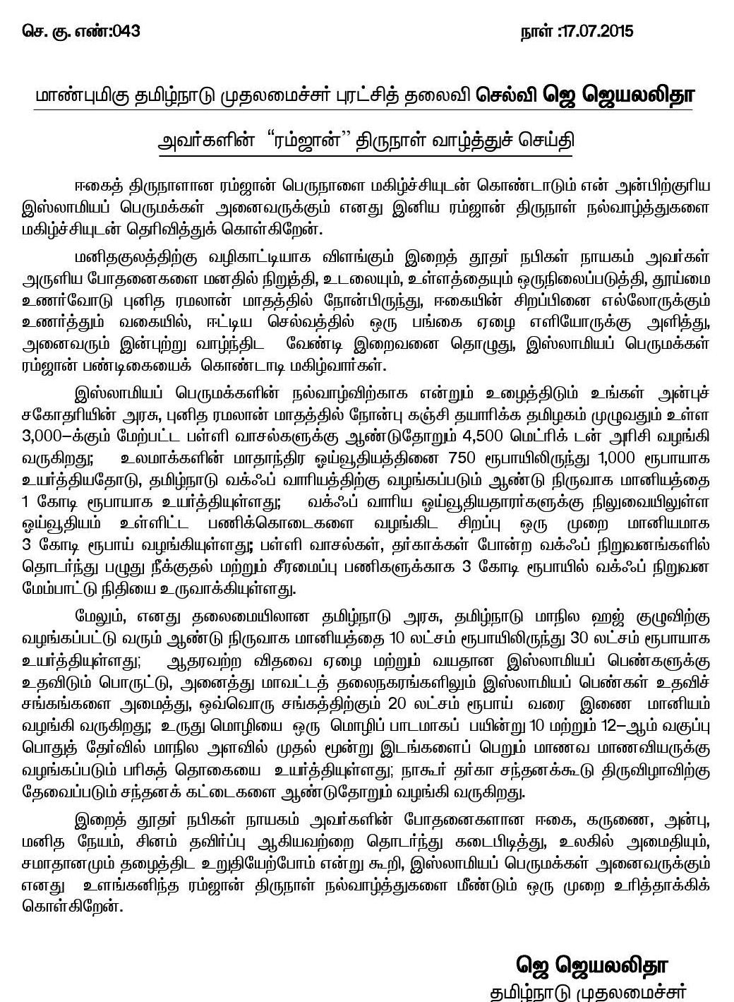 ஈகை, கருணை, அன்பு, மனித நேயம், சினம் தவிர்ப்பு ஆகியவற்றை தொடர்ந்து கடைபிடித்து, உலகில் அமைதியும், சமாதானமும் தழைத்திட உறுதியேற்போம்: தமிழ்நாடு முதலமைச்சர் ஜெ.ஜெயலலிதா ரம்ஜான் வாழ்த்து!