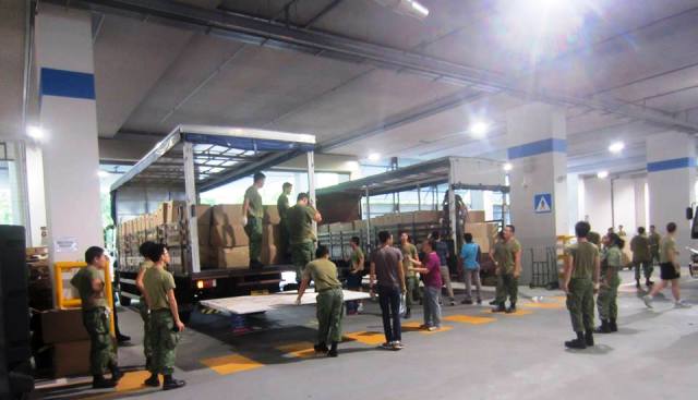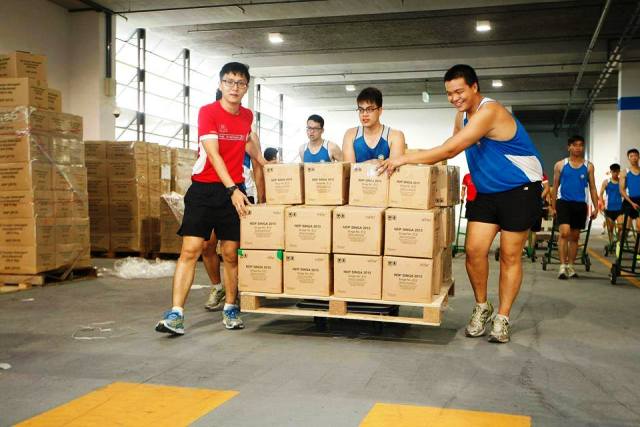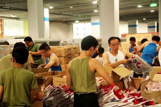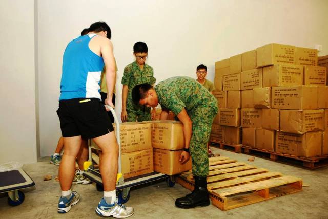 தேசிய சேவையாளர்கள் பலர் பெரிய பெரிய பெட்டிகளை நகர்த்தி, பைகளில் பொருட்களைப் போட்டு கடுமையாக உழைத்தனர். இந்நிலையில் பைகளைத் தயார் செய்யும் பணி நேற்று பிற்பகல் நிறைவு பெற்றது.