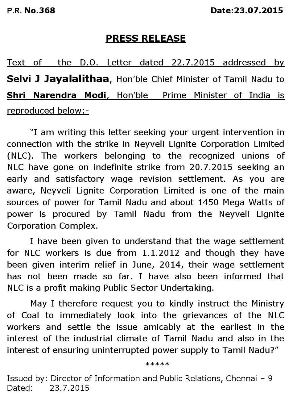 நெய்வேலி நிலக்கரி கழகத் தொழிலாளர்கள் காலவரையற்ற வேலை நிறுத்தம் மேற்கொண்டுள்ள விவகாரத்தில் தாங்கள் உடனே தலையிட வேண்டும் என்பதற்காக இந்த கடிதத்தை நான் உங்களுக்கு எழுதியுள்ளேன். நெய்வேலி நிலக்கரி கழகத்தின் அங்கீகரிக்கப்பட்ட தொழிற்சங்கத்தை சேர்ந்தவர்கள் விரைவான மற்றும் திருப்தியான ஊதிய திருத்தம் கோரி காலவரையற்ற வேலை நிறுத்தத்தை 20.07.2015 முதல் தொடங்கி நடத்தி வருகிறார்கள்.