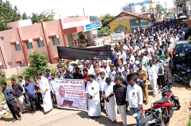 முன்னாள் குடியரசு தலைவர் அப்துல்கலாம் மறைவிற்கு இறுதி அஞ்சலி செலுத்தும் வகையில், பொதுமக்கள், பல்வேறு கட்சியினர், பள்ளி மாணவ, மாணவிகள் இணைந்து ஏற்காடு பஸ் நிலையத்தில் இருந்து, காந்தி பூங்கா வரை மௌன ஊர்வலம் வந்தனர். அப்போது ஒலிபெருக்கியில் அப்துல் கலாம் வாழ்கை வரலாறு வாசிக்கப்பட்டது.