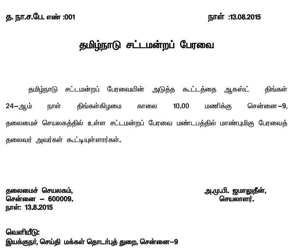 ஆகஸ்ட் 24-ஆம் தேதி தமிழக சட்டப்பேரவை கூட்டம்: சட்டப்பேரவைச் செயலாளர் ஜமாலுதீன் அறிவிப்பு !