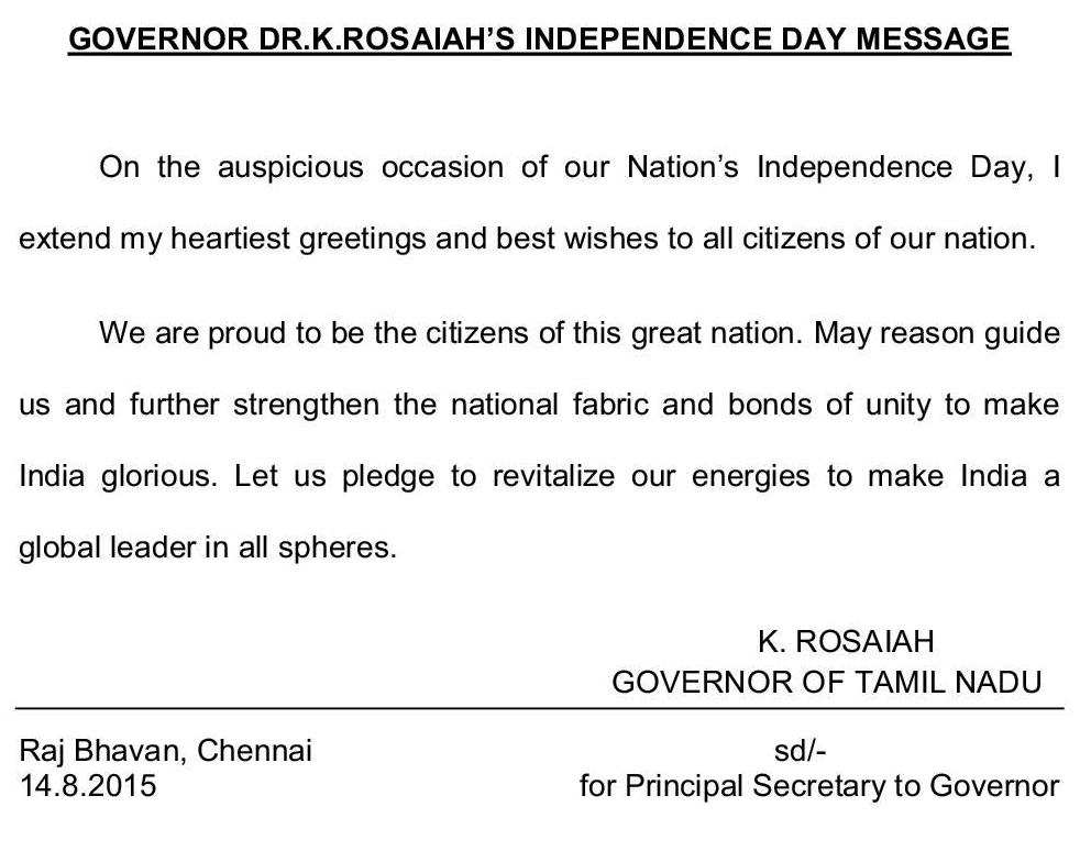 நம் நாட்டின் குடிமக்கள் அனைவருக்கும், எனது இதயப்பூர்வமான சுதந்திர தின வாழ்த்துக்களை தெரிவித்துக் கொள்கிறேன். நாம் இந்த நாட்டின் குடிமக்கள் என்பதில் பெருமையடைகின்றோம். நமது தேசிய கட்டமைப்பு மற்றும் ஒருமைபாடு, உலக அளவில் தலைமை தாங்க வழிவகுக்கும். இவ்வாறு தமிழக ஆளுநர் ரோசையா தமது வாழ்த்து செய்தியில் குறிப்பிட்டுயுள்ளார்.