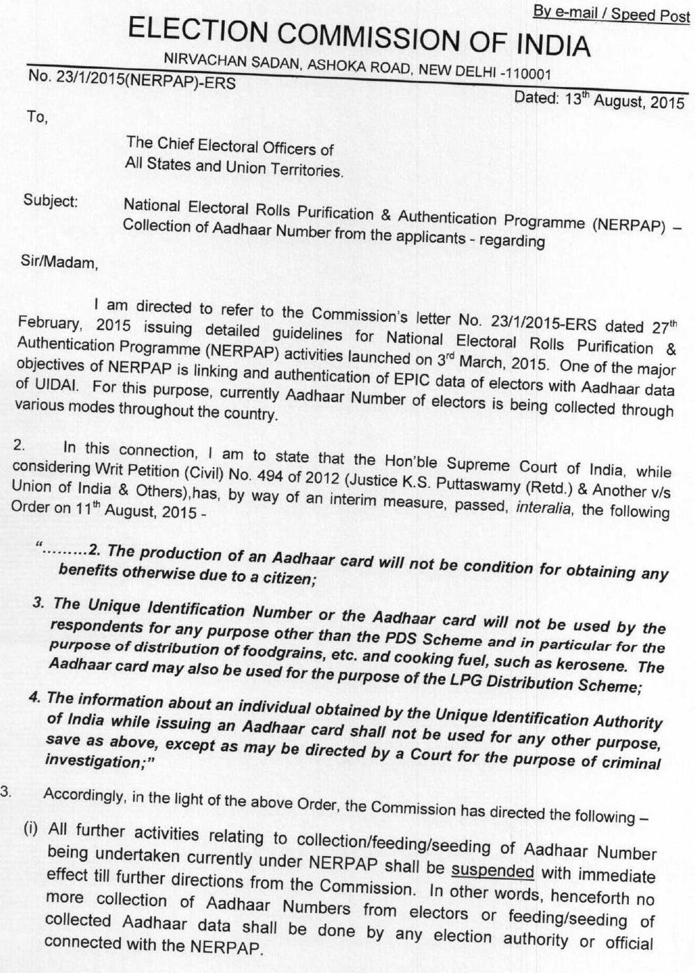 வாக்காளர் அடையாள அட்டையுடன் அவர்களின் ஆதார் எண்ணை இணைக்கும் பணியை மறு உத்தரவு வரும் வரை நிறுத்துமாறும், தேர்தல் ஆணையம் தனது உத்தரவில் கூறியுள்ளது.