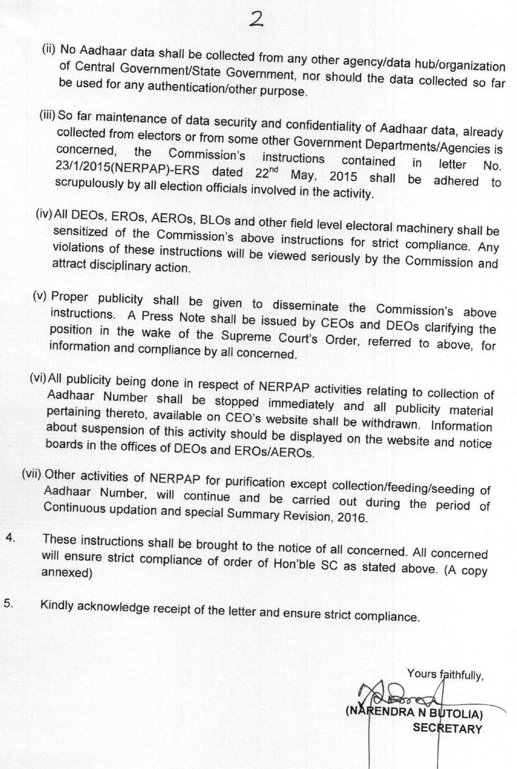இந்நிலையில் வாக்காளர்களிடம் ஆதார் எண்ணை கேட்கக்கூடாது என, அனைத்து மாநில தலைமை தேர்தல் அதிகாரிகளுக்கும் தேர்தல் ஆணையம் உத்தரவிட்டுள்ளது.