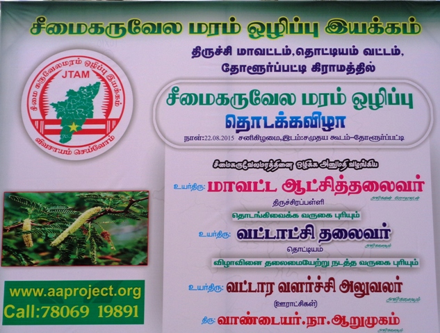 திருச்சி மாவட்டம், தொட்டியம் வட்டம், தோளுர்பட்டியில் உள்ள சமுதாய கூடத்தில், சீமைகருவேலமரம் ஒழிப்பு இயக்கம் சார்பாக, சீமைகருவேலமரம் ஒழிப்பு தொடக்க விழா இன்று நடைப்பெற்றது.