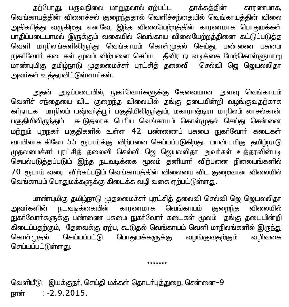 Home|News|வெங்காய விலையேற்றத்தினை கட்டுப்படுத்த வெளி மாநிலங்களிலிருந்து வெங்காயம் கொள்முதல்: தமிழக முதலமைச்சர் ஜெ.ஜெயலலிதா உத்தரவு! -கே.பி.சுகுமார்.