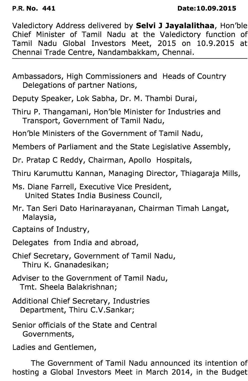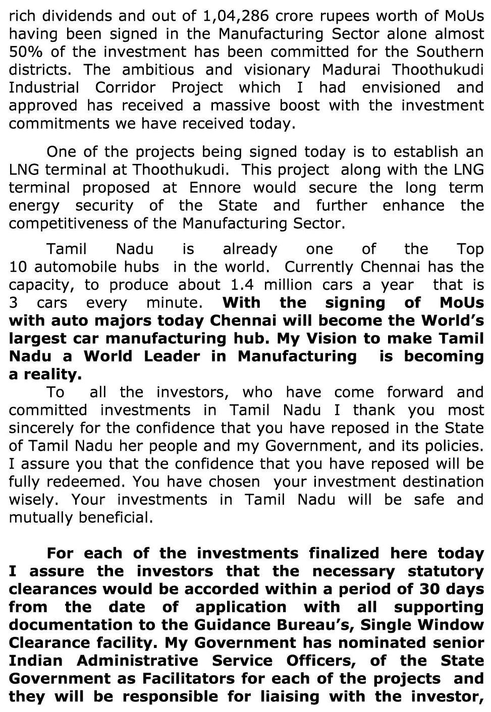முதலீட்டாளர்களின் சொர்க்க பூமியாகவும், ஆசியாவின் மிகப்பெரிய முதலீட்டு மையங்களில் ஒன்றாகவும் தமிழகம் மாறும் : தமிழக முதலமைச்சர் ஜெ.ஜெயலலிதா பேச்சு!