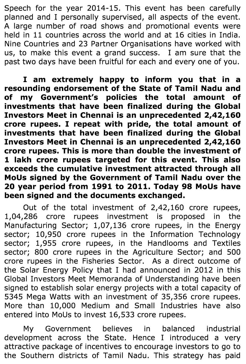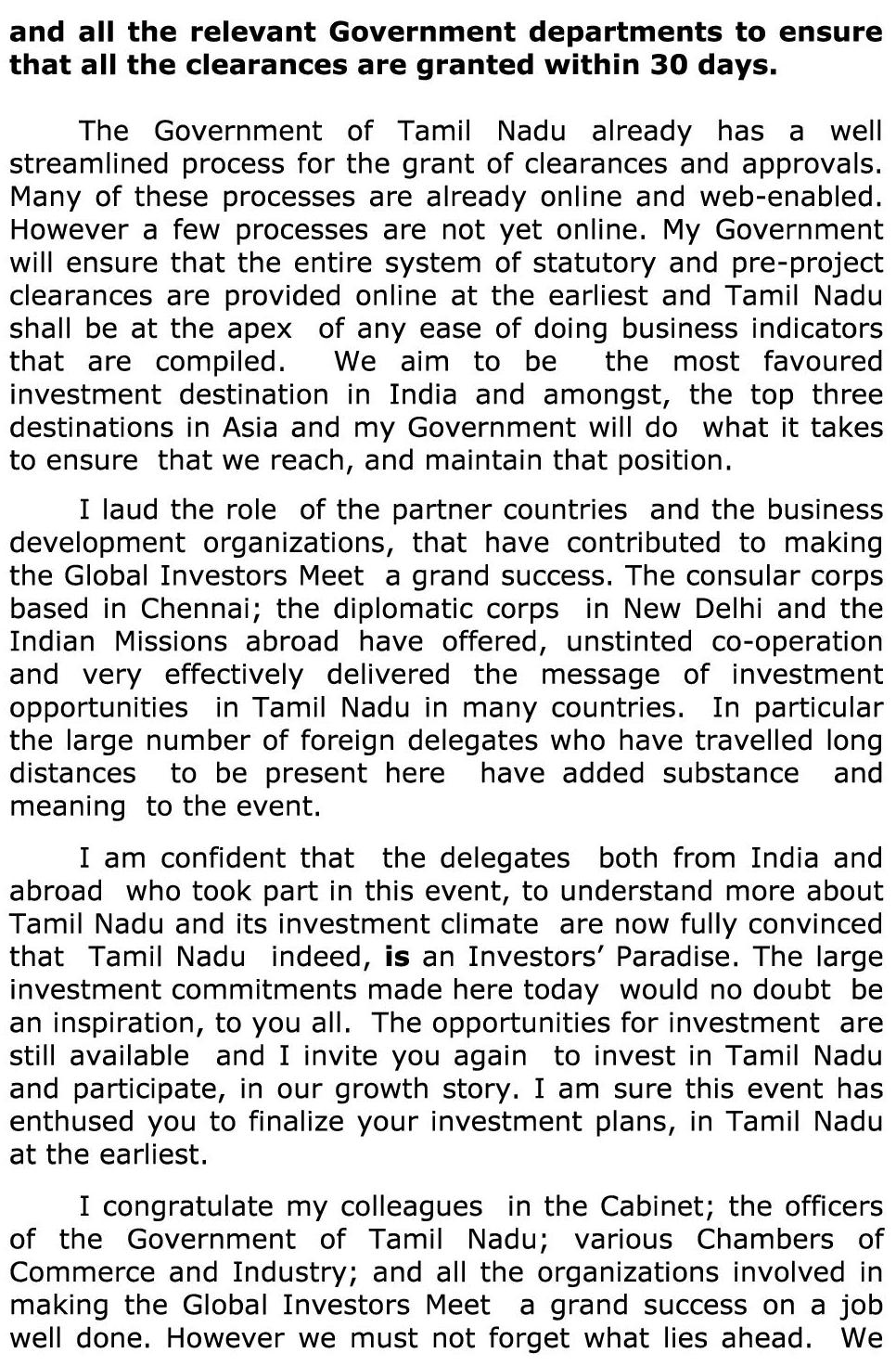 தமிழ்நாட்டில் தொழில் வளர்ச்சியை மேலும் மேம்படுத்த தமிழக அரசு சார்பில் சர்வதேச முதலீட்டாளர்கள் மாநாடு நந்தம்பாக்கம் வர்த்தக மையத்தில் நடந்தது. இரண்டு நாட்கள் நடைபெற்ற இந்த மாநாட்டின் நிறைவு விழா இன்று மாலை நடைபெற்றது. விழாவில் தமிழக முதலமைச்சர் ஜெ.ஜெயலலிதா பேசியதாவது:-