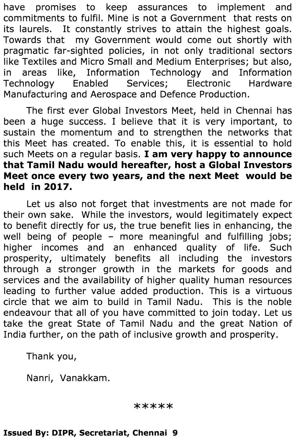 மேலும், 2 ஆண்டுகளுக்கு ஒரு முறை சர்வதேச முதலீட்டாளர் மாநாட்டை தமிழகம் நடத்தும். அடுத்த மாநாடு 2017ல் நடைபெறும்.