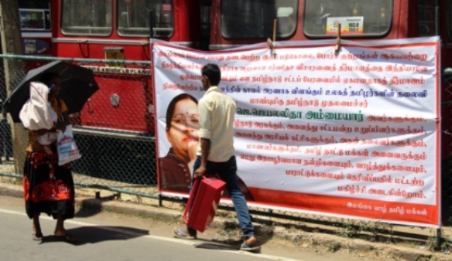 தமிழக முதலமைச்சர் ஜெ.ஜெயலலிதாவை பாராட்டி, இலங்கை யாழ்ப்பாணம், மத்திய பேருந்து நிலையத்திற்கு முன்பாக பிளக்ஸ் பேனர் வைக்கப்பட்டுள்ளது.