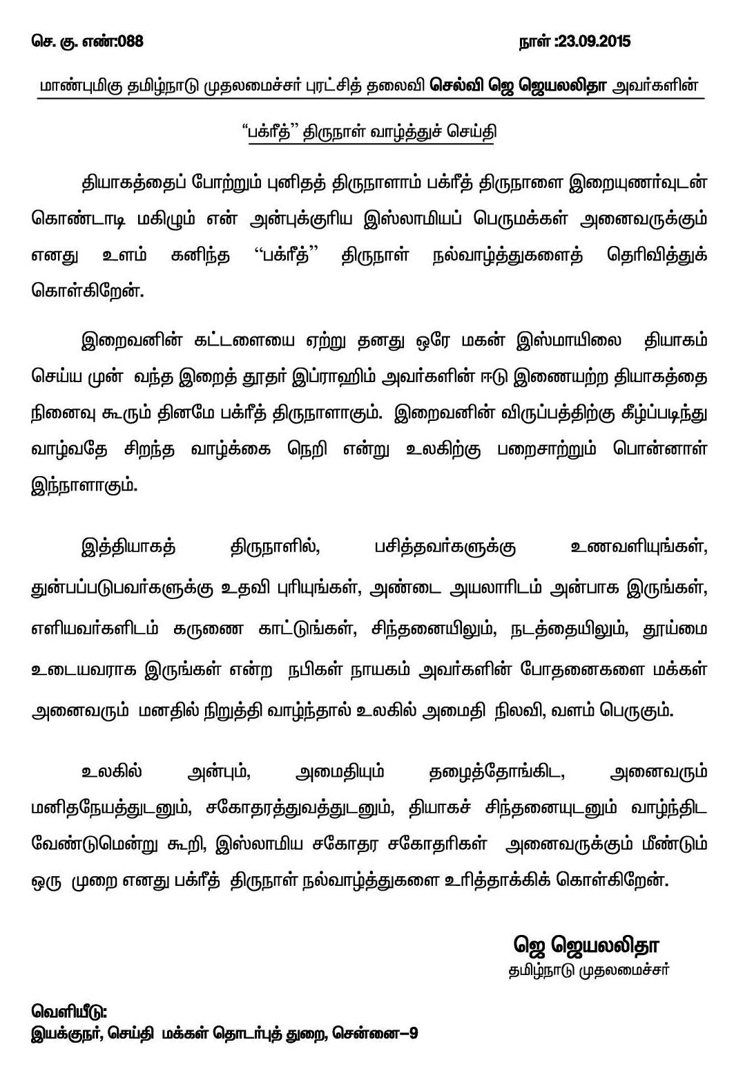 Home|News|அனைவரும் மனிதநேயத்துடனும், சகோதரத்துவத்துடனும், தியாகச் சிந்தனையுடனும் வாழ்ந்திட வேண்டும்: தமிழக முதலமைச்சர் ஜெ.ஜெயலலிதா பக்ரீத் திருநாள் வாழ்த்து! –ஆர்.அருண்கேசவன்.