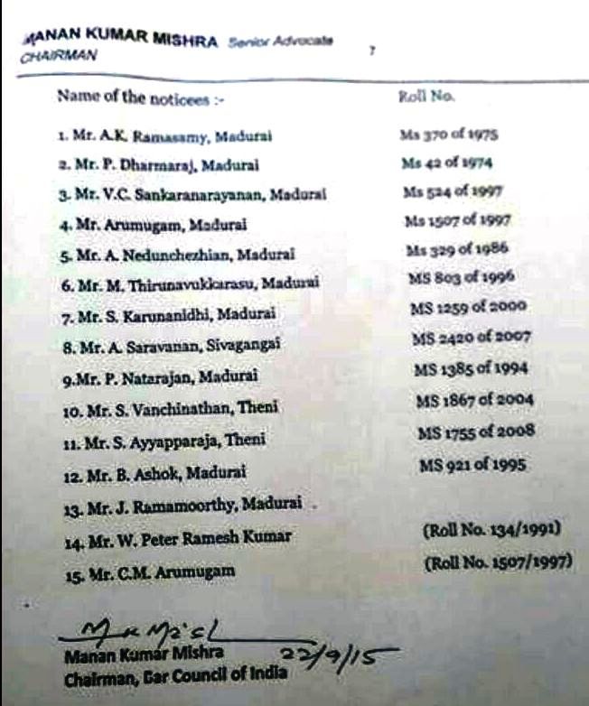 இது தொடர்பாக நடவடிக்கை மேற்கொண்டுள்ள அகில் இந்திய பார் கவுன்சில், போராட்டத்தில் ஈடுபட்ட மதுரை வழக்கறிஞர்கள் சங்க தலைவர் தர்மராஜ், செயலாளர் ராமசாமி உள்ளிட்ட 15 பேர், வழக்கறிஞர்களாக பணியாற்ற இடைக்கால தடை விதித்துள்ளது. இதற்கான உத்தரவில் இந்திய பார் கவுன்சில் தலைவர் மனன் குமார் மிஸ்ரா கையெழுத்திட்டுள்ளார்.