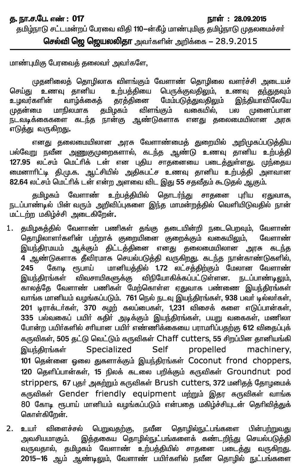 எனது தலைமையிலான ஆட்சியில் கடந்த ஆண்டு உணவு தானிய உற்பத்தி 127.95 லட்சம் மெட்ரிக் டன்! மைனாரிட்டி தி.மு.க. ஆட்சியில் அதிகபட்ச உணவு தானிய உற்பத்தி 82.64 லட்சம் மெட்ரிக் டன்!- தமிழக சட்டப்பேரவையில் முதல்வர் ஜெ.ஜெயலலிதா தகவல்.