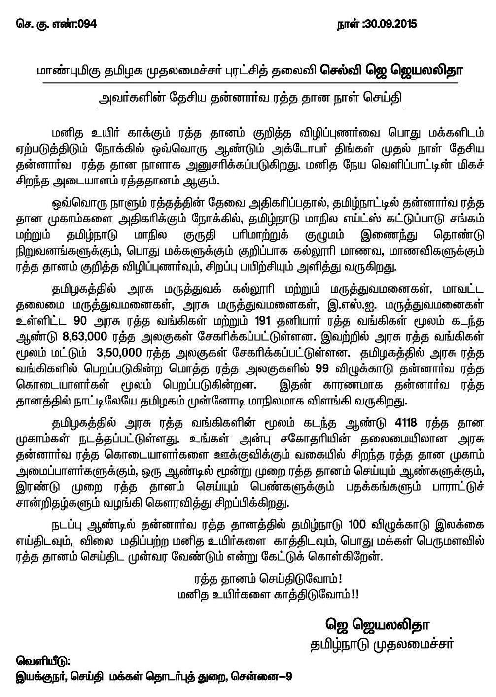 Home|News|விலை மதிப்பற்ற மனித உயிர்களை காத்திட, பொது மக்கள் பெருமளவில் ரத்த தானம் செய்திட முன்வர வேண்டும்: தமிழக முதல்வர் ஜெ.ஜெயலலிதா வேண்டுகோள்! -ஆர்.அருண்கேசவன்.