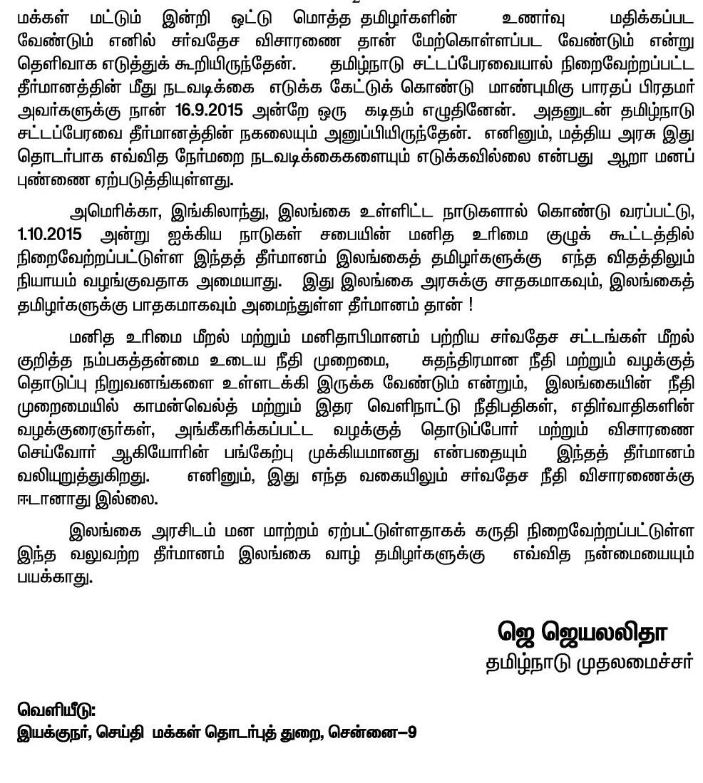 ஐ.நா மனித உரிமை குழுக் கூட்டத்தில் நிறைவேற்றப்பட்டுள்ள வலுவற்ற தீர்மானம், இலங்கை வாழ் தமிழர்களுக்கு எவ்வித நன்மையையும் பயக்காது: தமிழக முதலமைச்சர் ஜெ ஜெயலலிதா வேதனை.