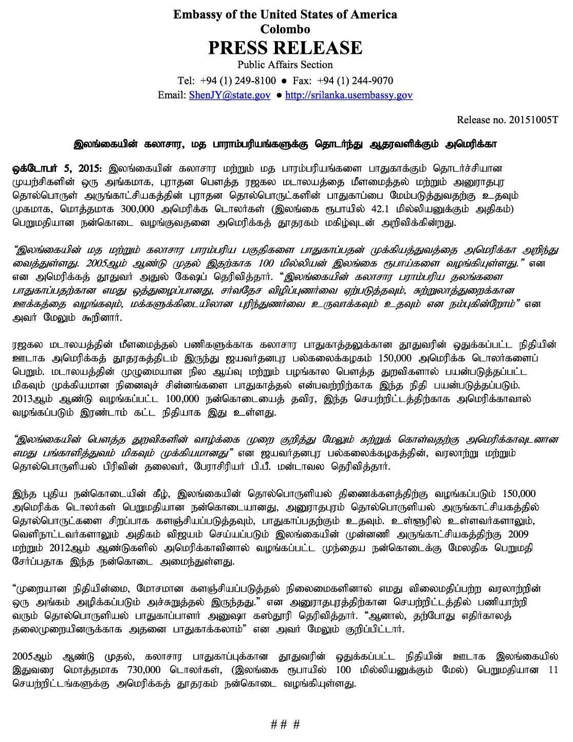 இலங்கையின் மத மற்றும் கலாசார பாரம்பரிய பகுதிகளை பாதுகாப்பதற்காக அமெரிக்கா 300,000 டொலர்கள் நன்கொடை!