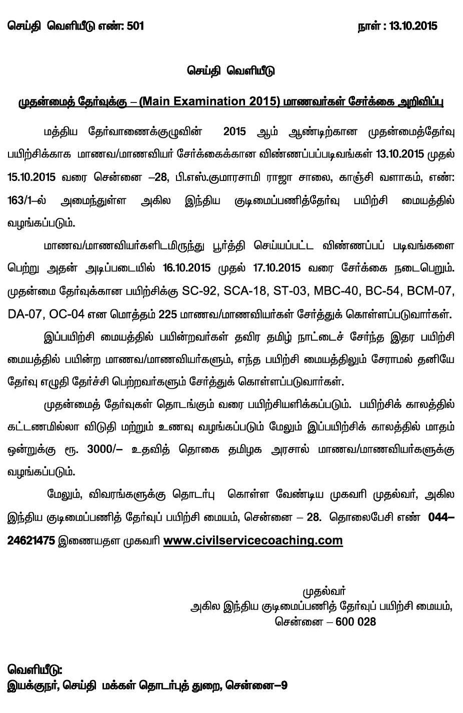 மத்திய தேர்வாணைக்குழு முதன்மைத் தேர்வுகள் தொடங்கும் வரை இலவச பயிற்சி, கட்டணமில்லா விடுதி, உணவு மற்றும் மாதம் ஒன்றுக்கு ரூ. 3000/- உதவித் தொகை வழங்கப்படும்: தமிழக அரசு தகவல்!