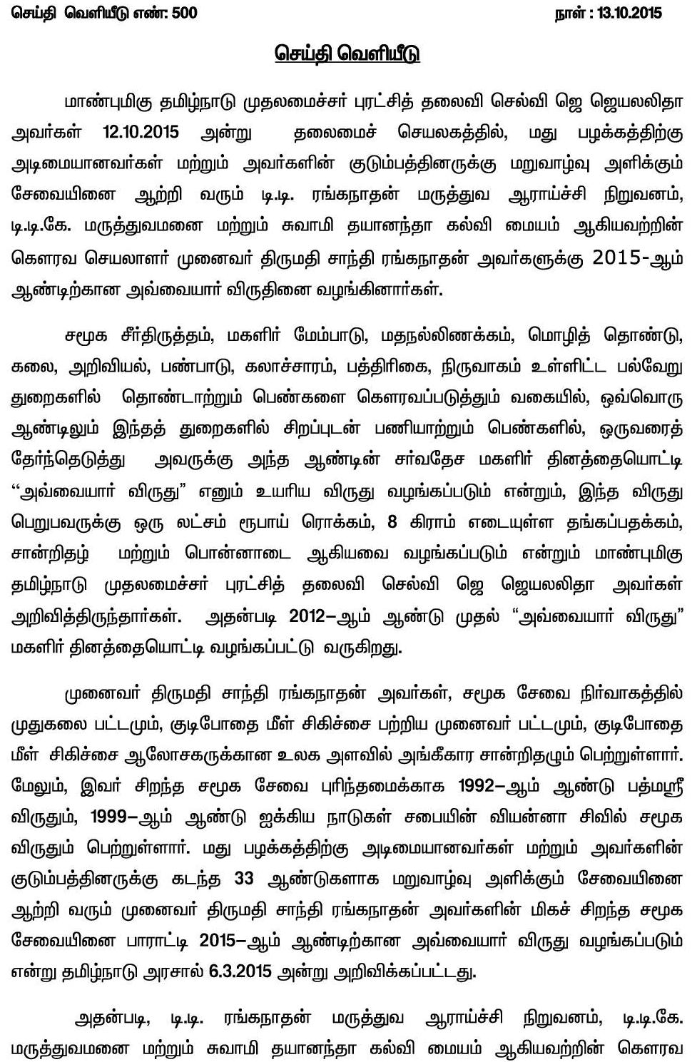 Home|News|2015-ஆம் ஆண்டிற்கான அவ்வையார் விருதினை சாந்தி ரங்கநாதனுக்கு, தமிழக முதலமைச்சர் ஜெ .ஜெயலலிதா வழங்கினார். -கே.பி.சுகுமார்.
