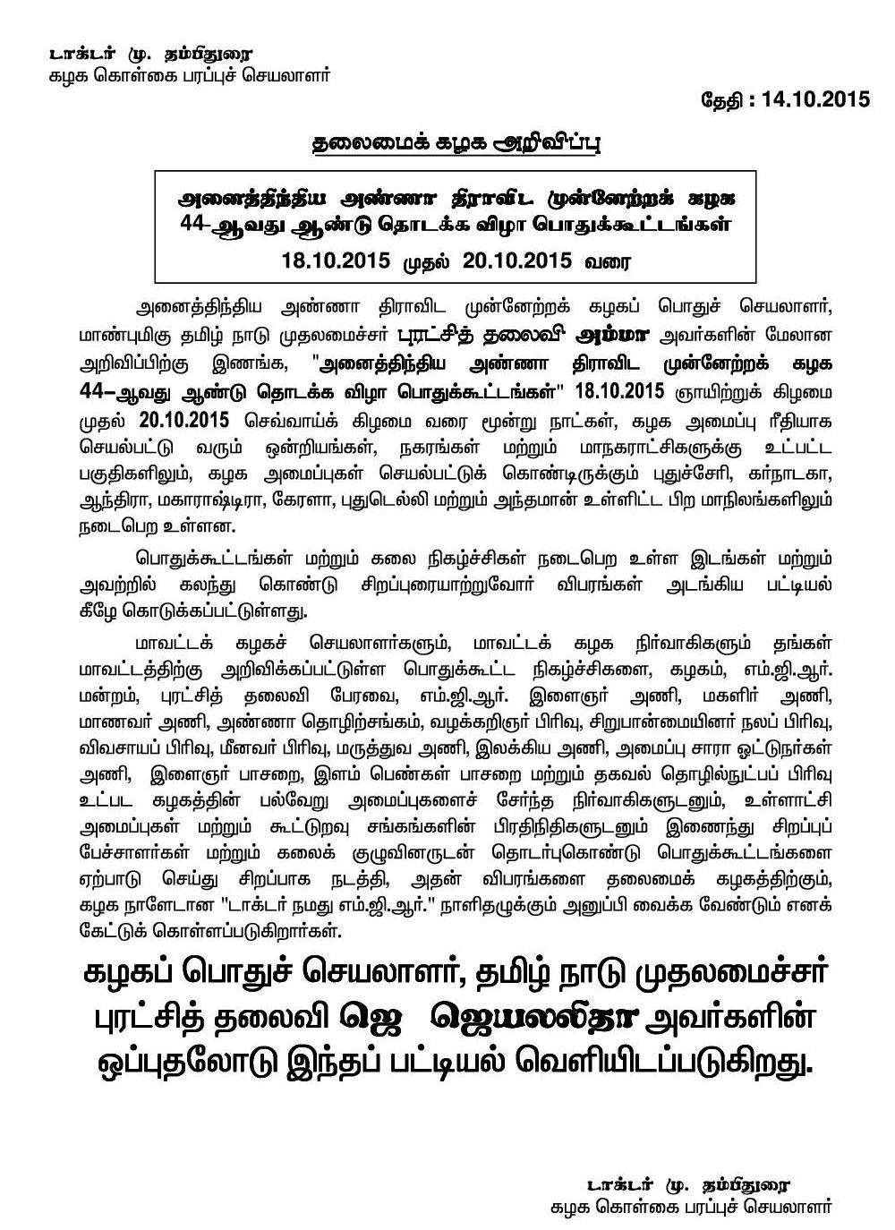 Home|News|அ.இ.அ.தி.மு.க 44-ஆவது ஆண்டு தொடக்க விழா விபரங்கள் அடங்கிய பட்டியல்: டாக்டர் மு. தம்பிதுரை வெளியீடு. -ஆர்.அருண்கேசவன்.