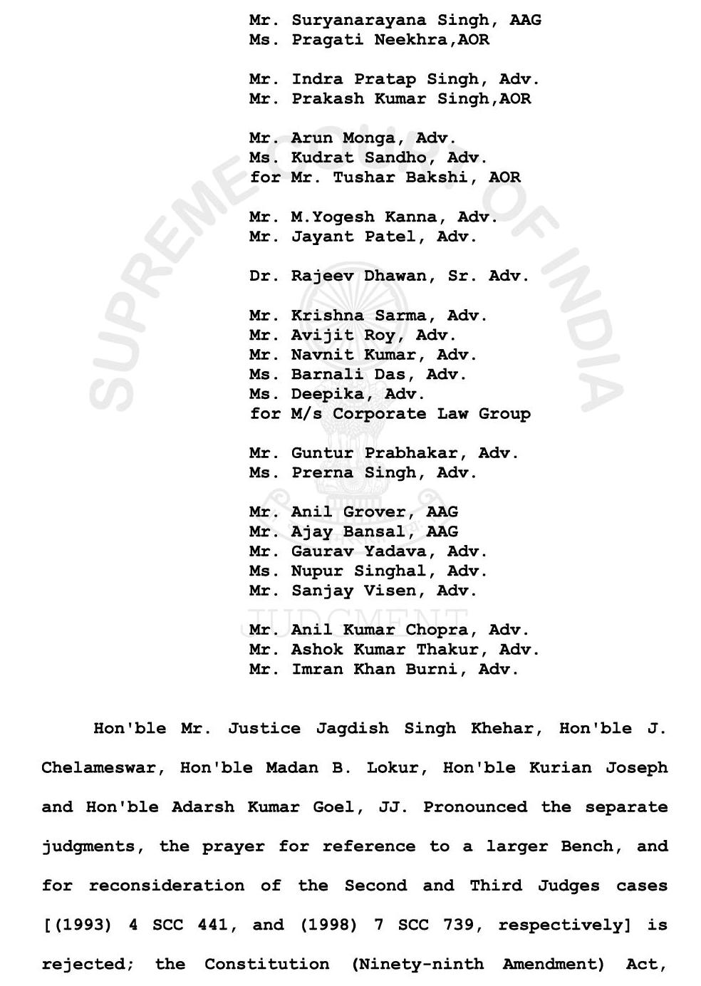நீதிபதிகள் ஜே.எஸ்.கெஹர், மதன் பி.லோகுர், குரியன் ஜோசப், ஆதர்ஷ் குமார் கோயல் ஆகிய 4 நீதிபதிகள் கொலிஜியம் முறைக்கு ஆதரவாகவும், தேசிய நீதிபதிகள் நியமன ஆணைய சட்டத்துக்கு எதிராகவும், இத்தீர்ப்பில் தங்கள் கருத்துகளை பதிவு செய்தனர்.
