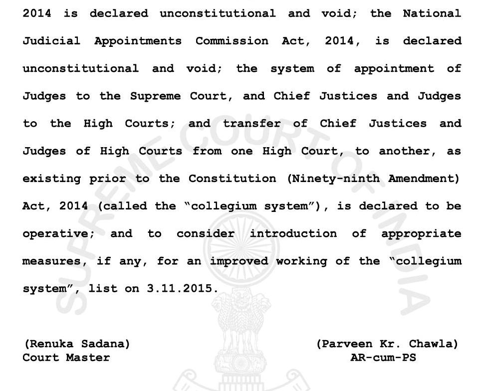 (2) நீதிபதிகள் நியமனத்தில் கொலிஜியம் முறையை மாற்றி நீதிபதிகள் நியமன ஆணையத்தை அமைக்கும் வகையில் செய்யப்படும் 99–வது அரசியல் ஆணைய சட்டத்திருத்த சட்டம், 2014 அரசியல் சட்டத்துக்கு எதிரானது என்றும் செல்லாதது என்றும் அறிவிக்கப்படுகிறது.