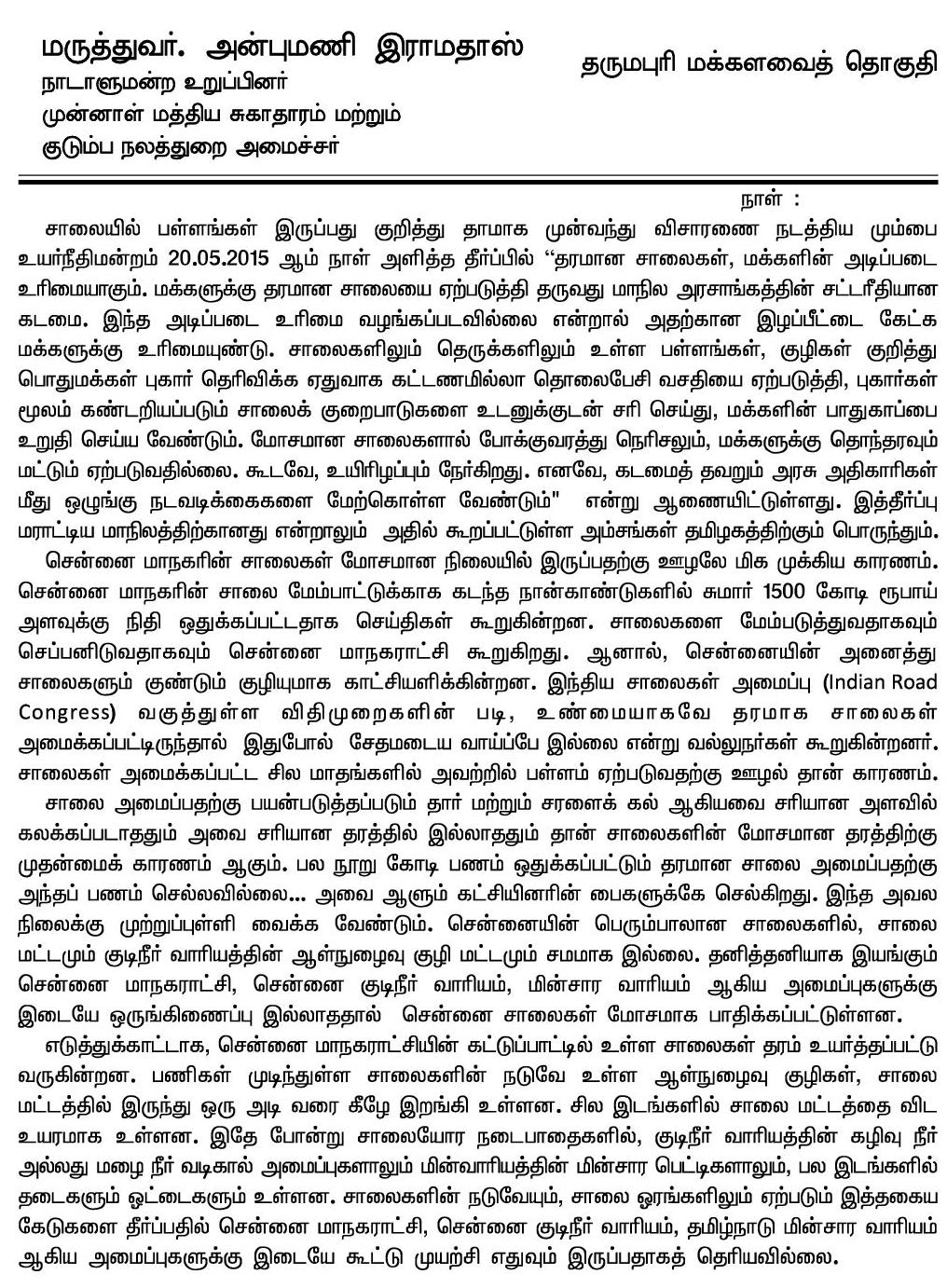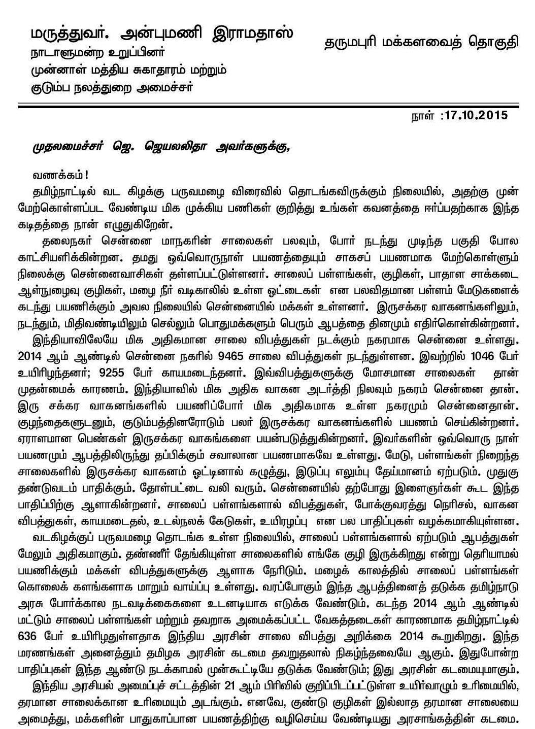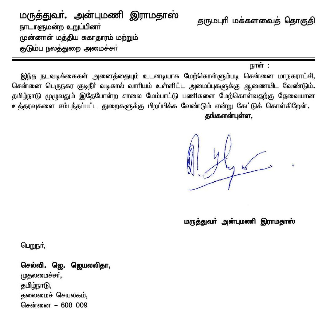 Home|News|தமிழக முதல்வர் ஜெ.ஜெயலலிதாவுக்கு, அன்புமணி ராமதாஸ் கடிதம்!- கடிதத்தின் உண்மை நகல் இணைப்பு! -ஆர்.அருண்கேசவன்.