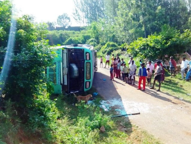 ஏற்காட்டில் இருந்து 23 கிலோ மீட்டர் தொலைவில் உள்ள பெரியேரிக்காடு கிராமத்தில் இருந்து 23 பயணிகளுடன் TN-38 N-1415 என்ற அரசு பேருந்து புறப்பட்டது. பேருந்தை டிரைவர் மாதேஸ்வரன் ஓட்டி வந்துள்ளார். அந்த பேருந்தை ஆனைக்காடு மற்றும் நல்லூர் பிரிவு ரோட்டில் நல்லூர் கிராமத்திற்கு டிரைவர் வளைக்க முற்படும்போது பிரேக் ஃபெயிலியராகி பக்கவாட்டில் கவிழ்ந்தது.