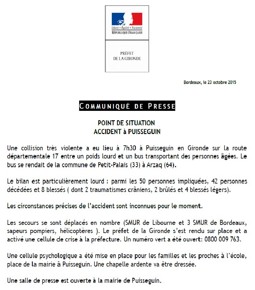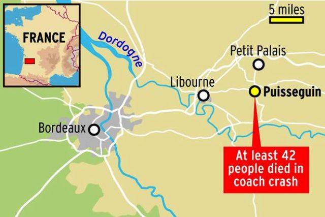 பிரான்ஸின் மேற்கு பகுதியில் உள்ள லிபோர்ன் என்ற நகருக்கு அருகில் உள்ள Puisseguin கிராமப்புறத்தில் பயணிகள் பேருந்து ஒன்று நிலை தடுமாறி லாரி மீது பயங்கரமாக மோதி வெடித்து சிதறியதில் 42 பேர் பலியாகியுள்ளனர்.