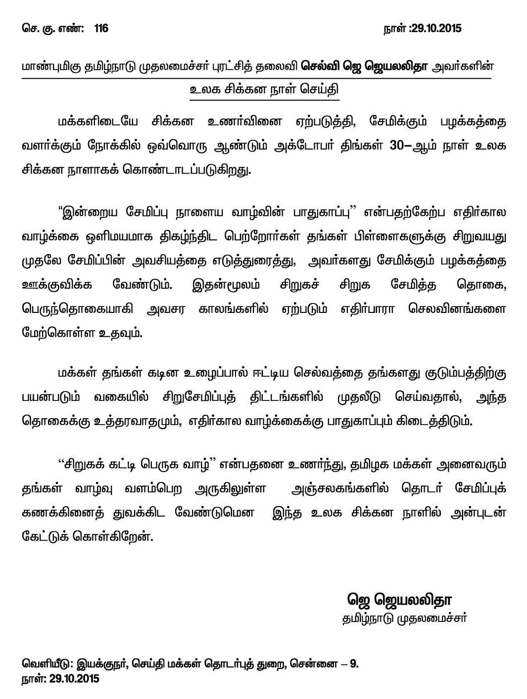 தங்கள் பிள்ளைகளுக்கு சிறுவயது முதலே சேமிக்கும் பழக்கத்தை ஊக்குவிக்க வேண்டும் : தமிழக முதலமைச்சர் ஜெ. ஜெயலலிதா வேண்டுகோள்!