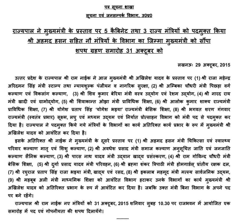 இதனை ஆளுநர் ஏற்றுக்கொண்டதாகவும், புதிய அமைச்சர்கள் நாளை (31.10.2015) 10.30 மணிக்கு பதவி ஏற்பார்கள் என்றும், உத்தர பிரதேச ஆளுநர் அதிகாரப்பூர்வ அறிவித்துள்ளார்.