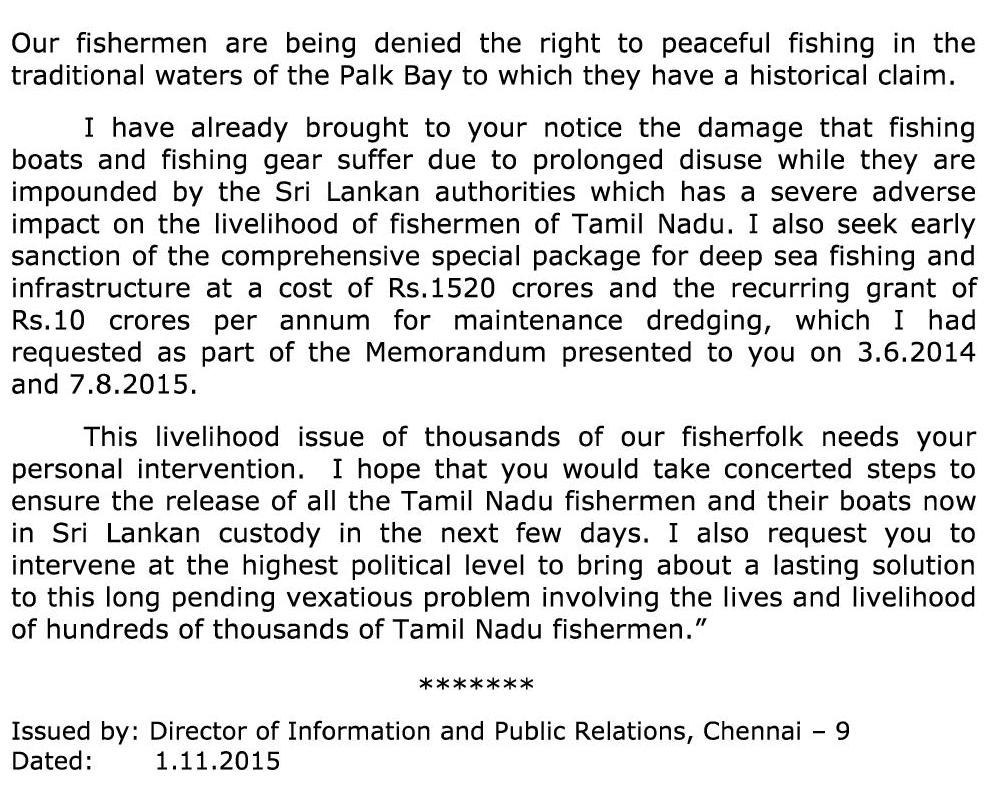 நேற்று இரவு கச்சத்தீவுக்கும், தலைமன்னாருக்கும் இடைப்பட்ட கடல் பகுதியில் படகுடன் சிறைப்பிடிக்கப்பட்ட 6 மீனவர்களையும், அவர்களது படகுகளையும் விடுவிக்க வேண்டும் எனவும், மீனவர்களை சிறைபிடிக்கும் விவகாரத்தில் நிரந்தர தீர்வு காண வேண்டும் என்றும், தமிழக மீனவர்களின் வாழ்வாதாரத்தில் தனி கவனம் வேண்டும் என்றும், பாரம்பரியமான பகுதிகளில் பாதுகாப்பாக மீன்பிடிக்க நடவடிக்கை எடுக்க வேண்டும் எனவும் முதல்வர் ஜெ.ஜெயலலிதா தனது கடிதத்தில் வலியுறுத்தியுள்ளார்.