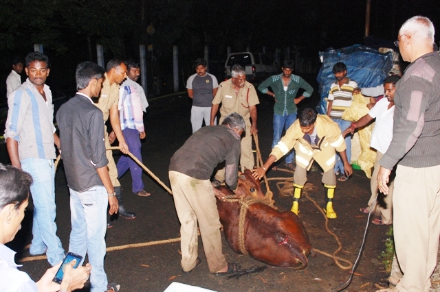 உடனே, சம்பவ இடத்திற்கு வந்த ஏற்காடு தீயைணைப்பு துறையினர் கயிறு கட்டி அந்த மாட்டை மீட்டனர்.