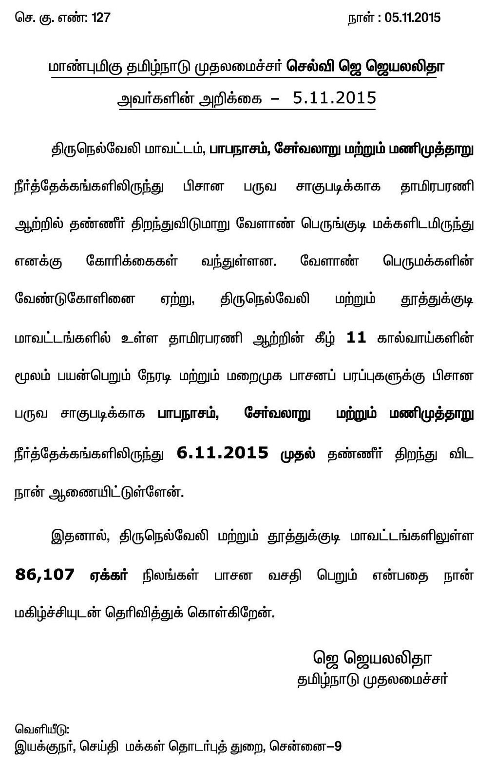 Home|News|சாகுபடிக்காக பாபநாசம், சேர்வலாறு மற்றும் மணிமுத்தாறு நீர்த்தேக்கங்களிலிருந்து தண்ணீர் திறந்து விட, தமிழ்நாடு முதலமைச்சர் ஜெ. ஜெயலலிதா உத்தரவு! -கே.பி.சுகுமார்.