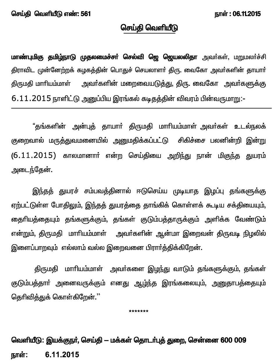 Home|News|வைகோ தாயார் மாரியம்மாள் மறைவிற்கு, தமிழ்நாடு முதலமைச்சர் ஜெ.ஜெயலலிதா இரங்கல்! -கே.பி.சுகுமார்.