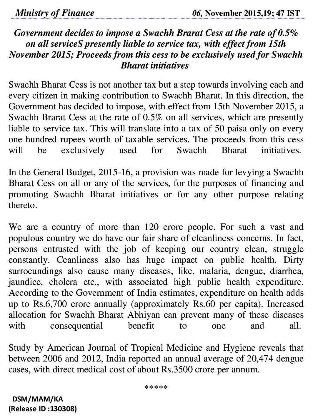 இந்த 0.5% சதவீத சேவை வரி உயர்வின் மூலம் கிடைக்கும் தொகை முழுவதும் தூய்மை இந்தியா திட்டத்துக்காக செலவிட உள்ளதாக மத்திய நிதி அமைச்சகம் அறிவித்துள்ளது.