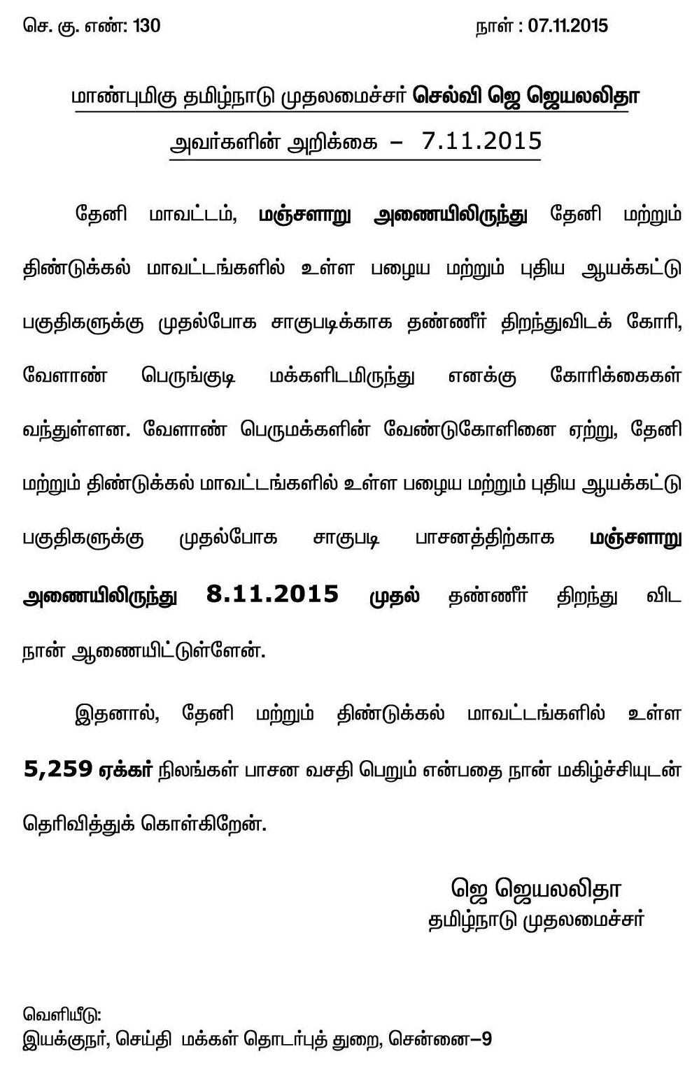தேனி மாவட்டம், மஞ்சளாறு அணையிலிருந்து முதல்போக சாகுபடிக்காக தண்ணீர் திறந்துவிட, தமிழ்நாடு முதலமைச்சர் ஜெ. ஜெயலலிதா உத்தரவு!
