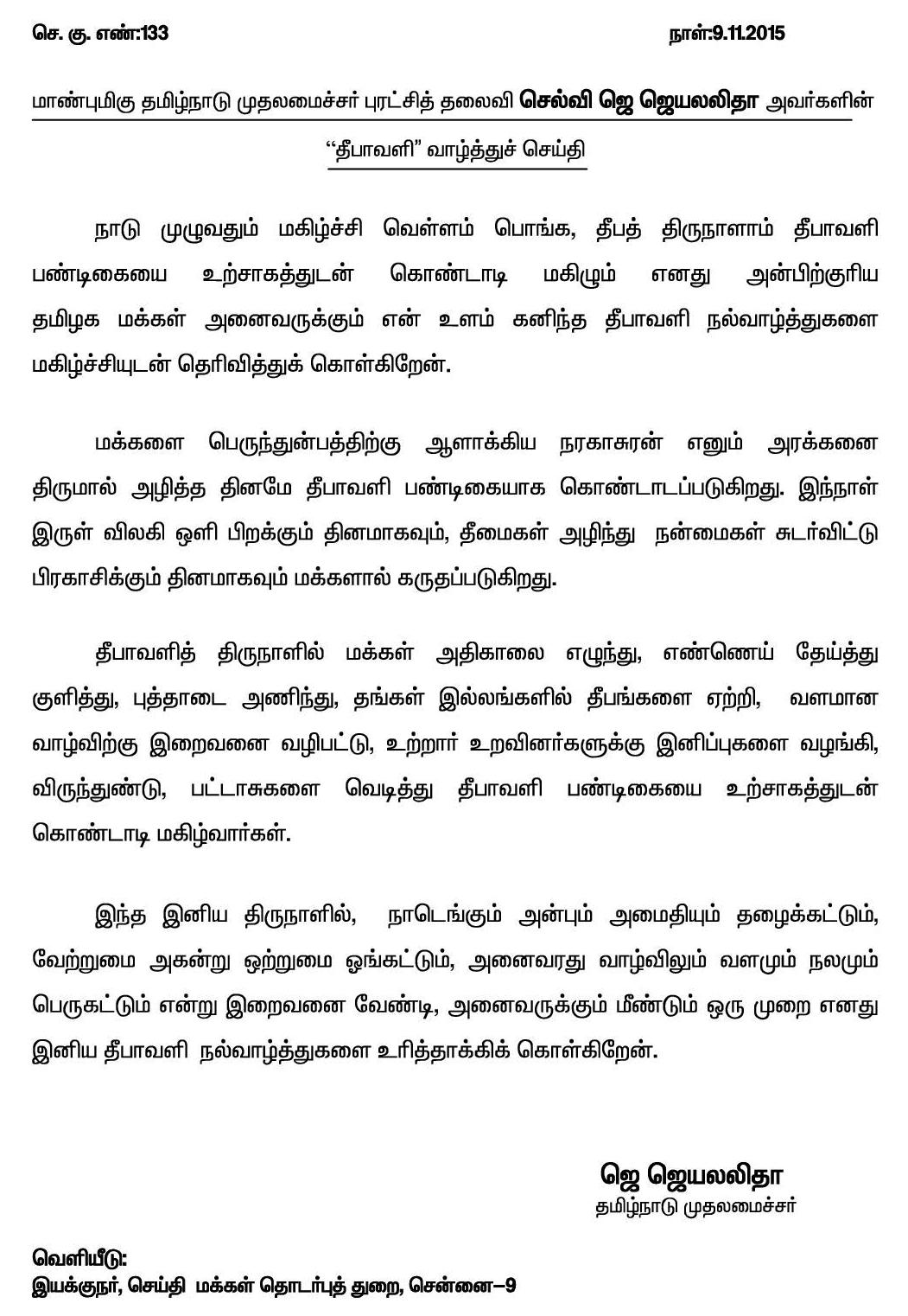 Home|News|அன்பும் அமைதியும் தழைக்கட்டும், வேற்றுமை அகன்று ஒற்றுமை ஓங்கட்டும், அனைவரது வாழ்விலும் வளமும் நலமும் பெருகட்டும் : தமிழக முதல்வர் ஜெ.ஜெயலலிதா தீபாவளி வாழ்த்து! -கே.பி.சுகுமார்.