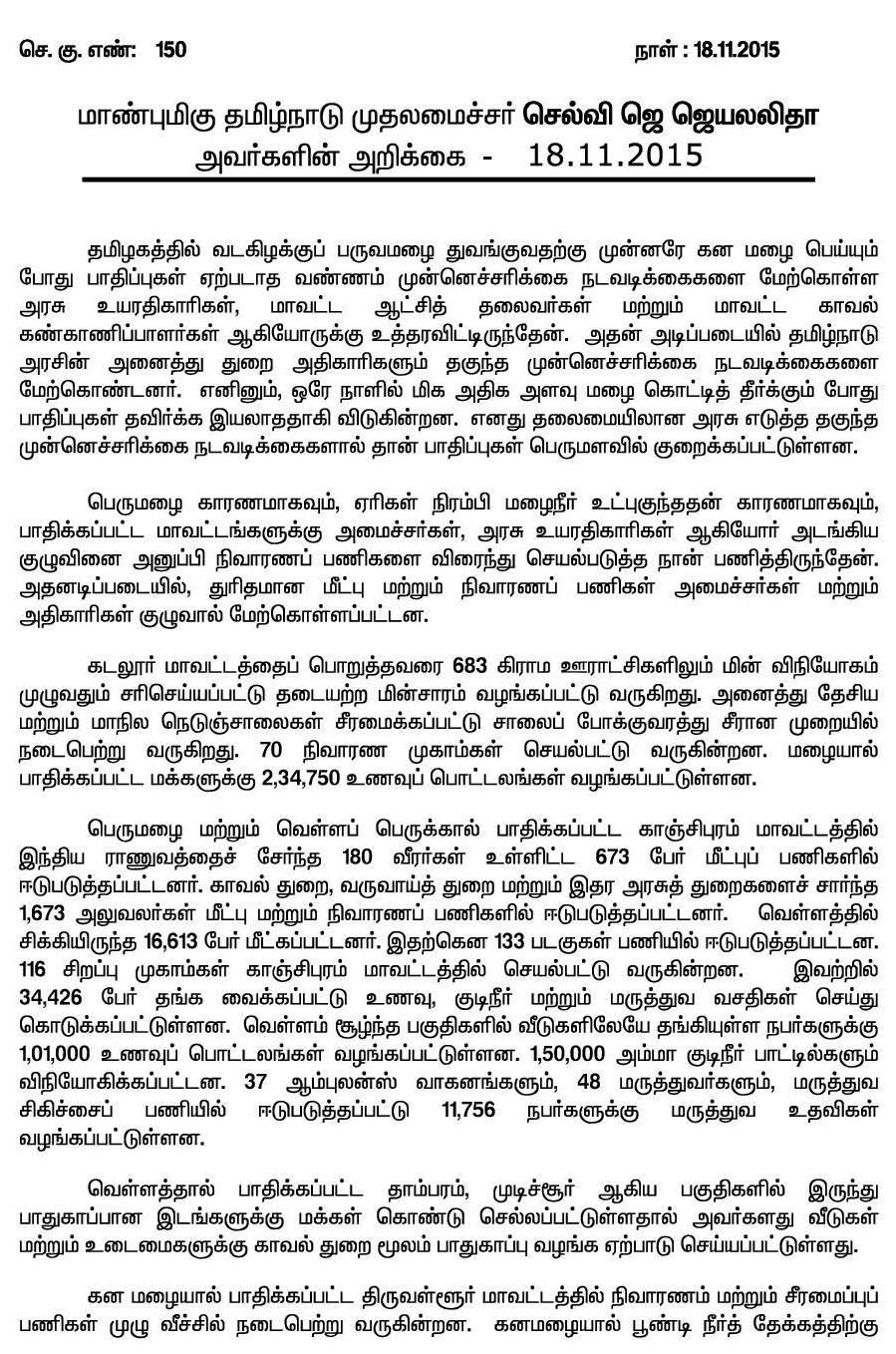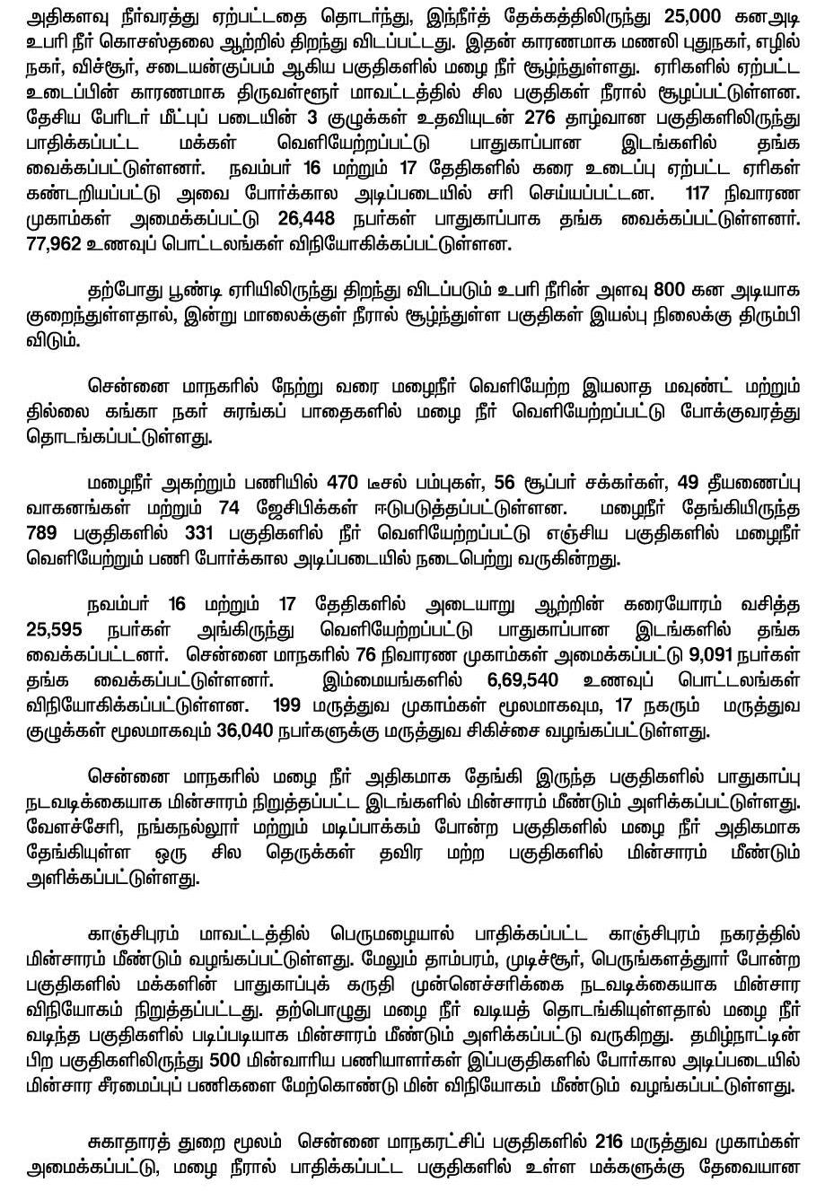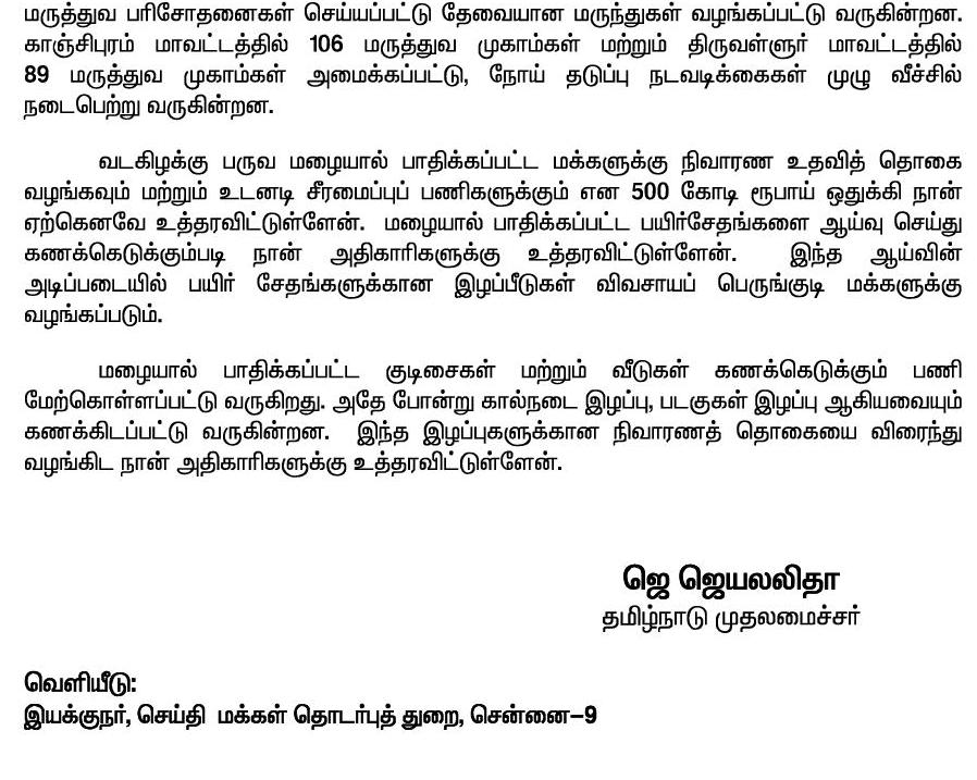 மழை மற்றும் வெள்ள நிவாரணம் குறித்து அமைச்சர்கள் மற்றும் உயர் அதிகாரிகளுடன், தமிழக முதல்வர் ஜெ.ஜெயலலிதா ஆலோசனை!-அறிக்கையின் முழுவிபரம்.