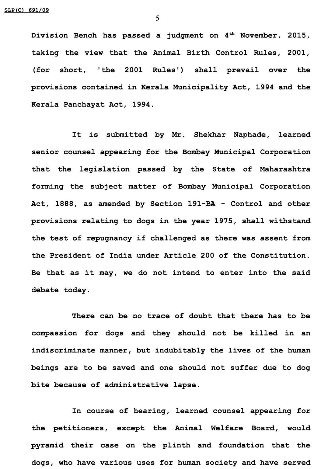 அதில், நாய்களின் வாழ்நாளை விட, மனித உயிர்களே மேலானது. பிராணிகள் வதை தடுப்பு சட்டம் மற்றும் பிறப்பு கட்டுப்பாடு விதிகளின் கீழ் மனித உயிர்களுக்கு அச்சுறுத்தலாக உள்ள தெரு நாய்கள், வெறி நாய்கள் மற்றும் நோய் வாய்ப்பட்ட நாய்களை கொல்ல தடை இல்லை என தீர்ப்பு அளித்தனர்.